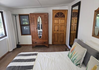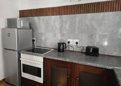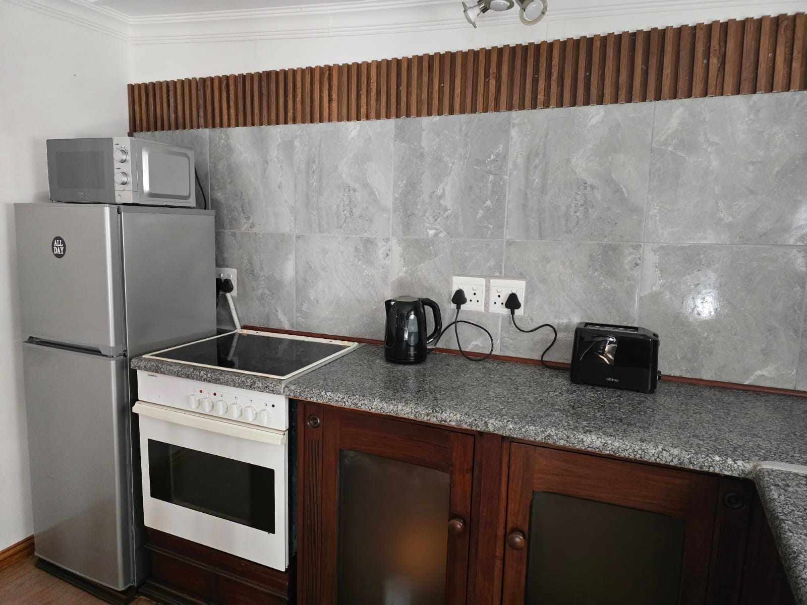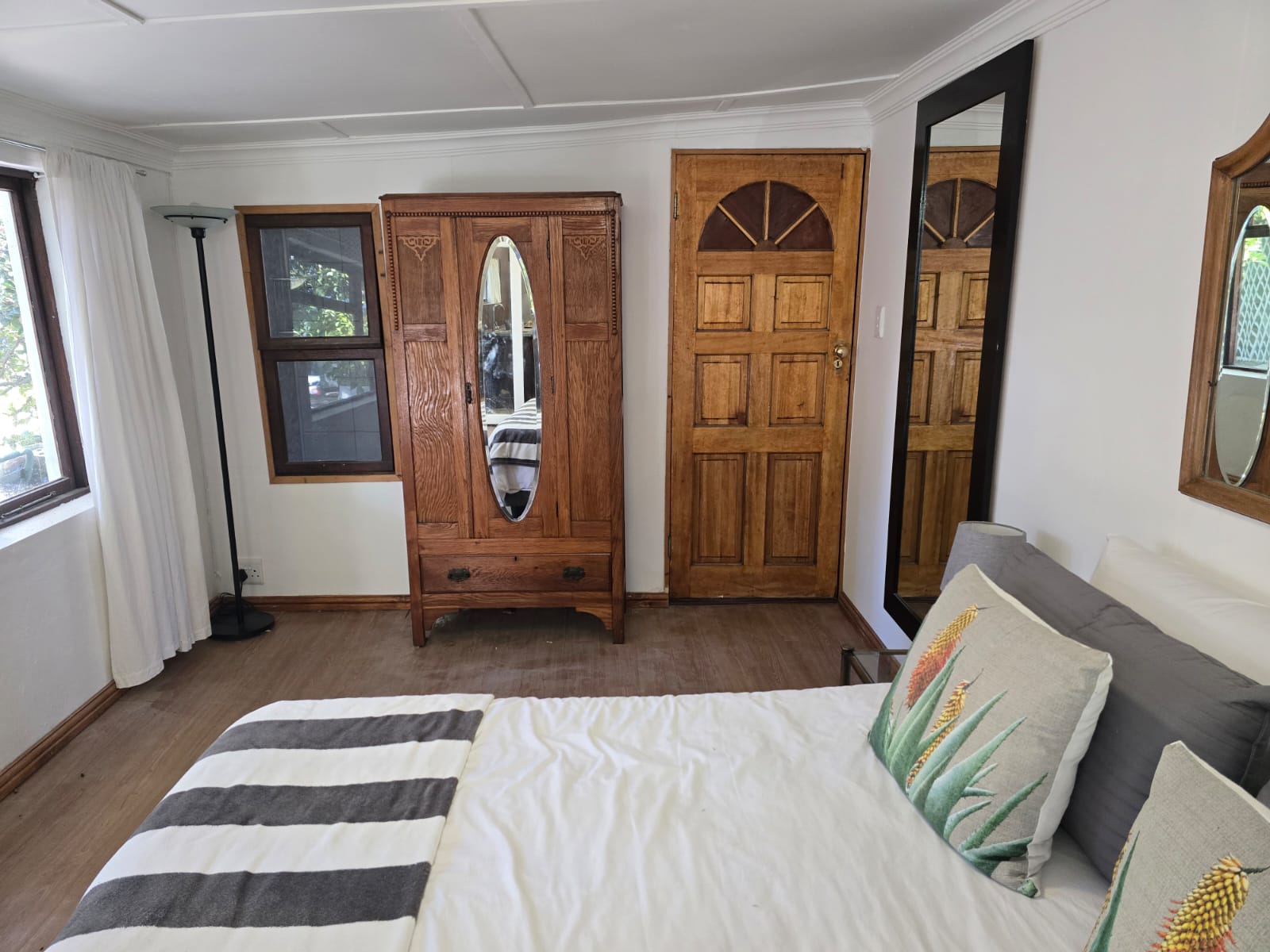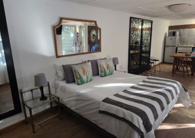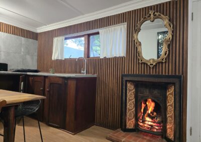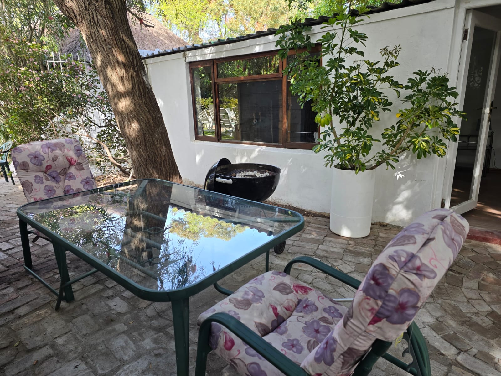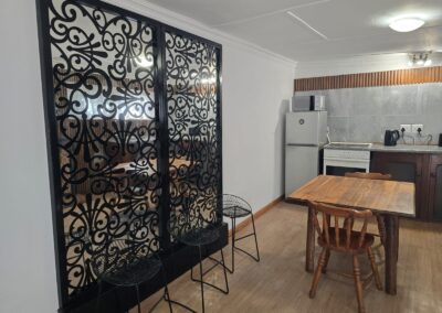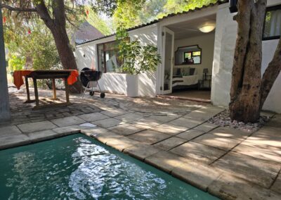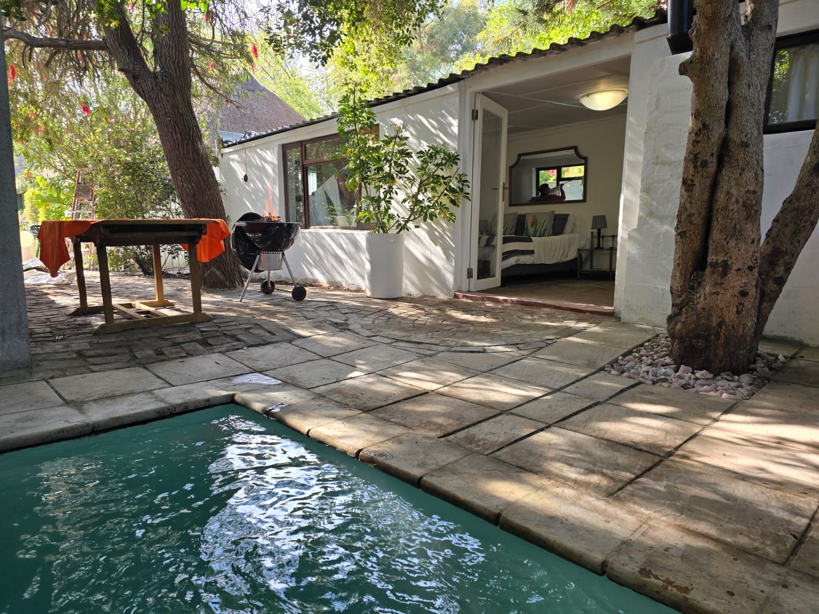 Slip into your own sanctuary: a private splash pool edged by greenery, an intimate garden with outdoor dining, and a welcoming fireplace for cooler evenings. Inside, the suite flows from a comfortable sleeping area to a neat kitchen with everything you need for easy meals. Morning light filters in, birds settle in the trees, and the pace of the city feels a world away — even though you’re minutes from Constantia.